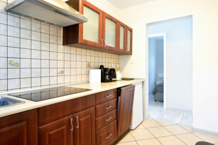 Apartament jednopokojowy składa się z dużego pokoju z dwoma wygodnymi łóżkami połączonego z aneksem kuchennym oraz łazienkę z prysznicem.