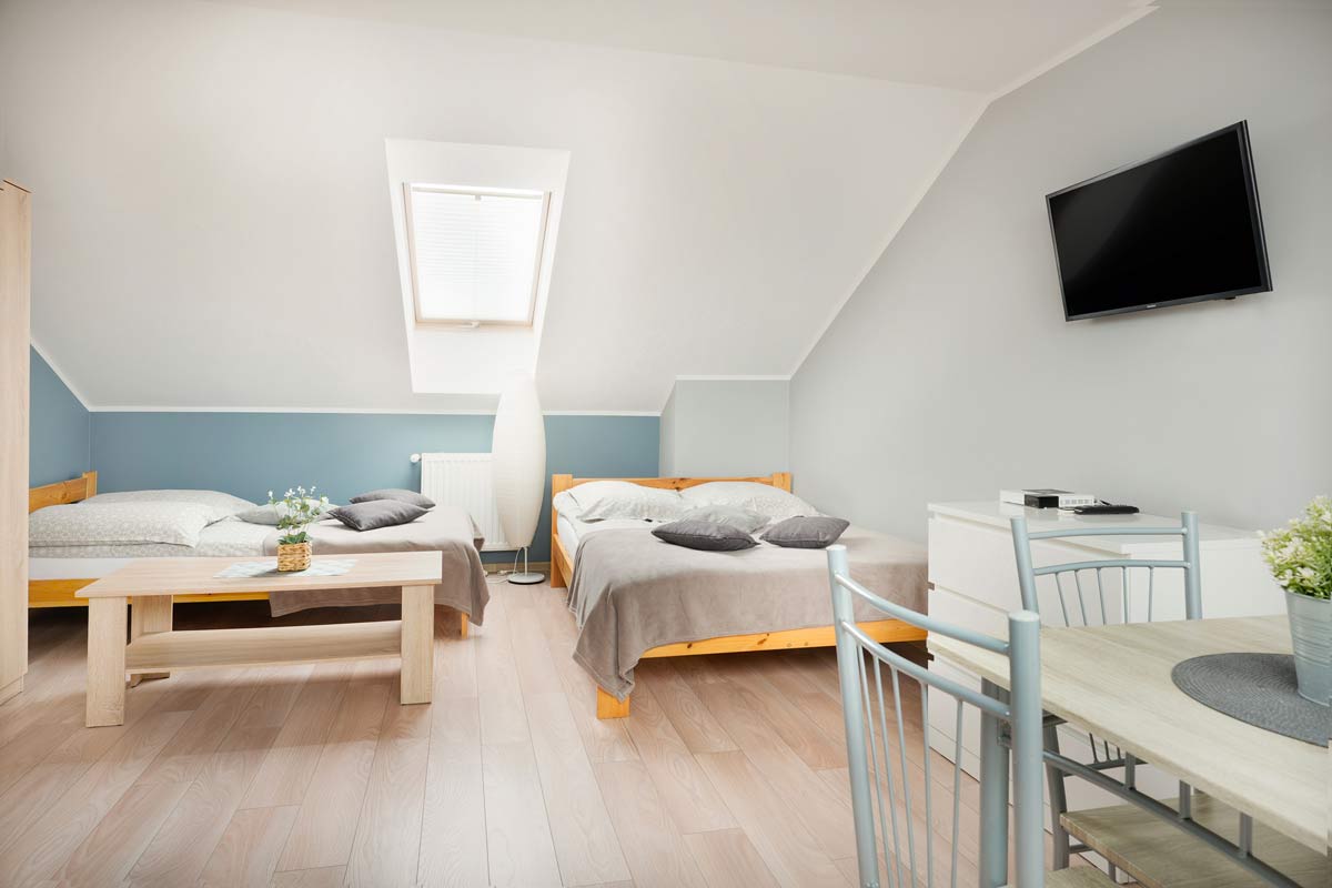 Apartament jednopokojowy składa się z dużego pokoju z dwoma wygodnymi łóżkami połączonego z aneksem kuchennym oraz łazienkę z prysznicem.