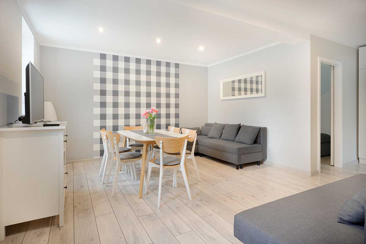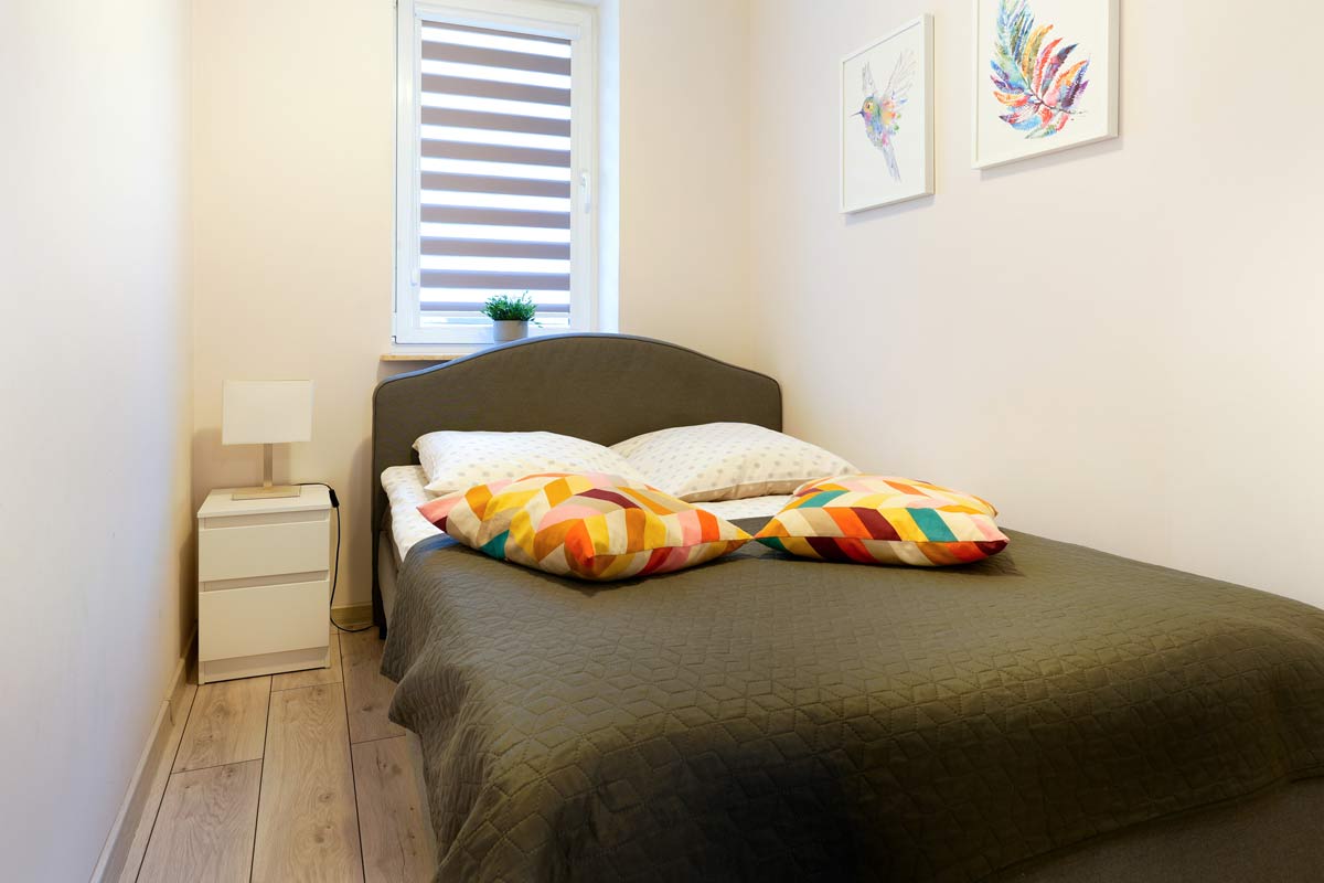 Apartament dwupokojowy, składa się z osobnej sypialni z łóżkiem małżeńskim oraz dużego salonu w którym znajduje sie rogówka oraz wersalka.
